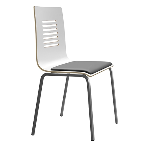 Estrutura Metálica (em tubo quadrado) cromado ou pintado a epoxy. Assento e Costa Integral em contraplacado folheado a Faia ou HPL.